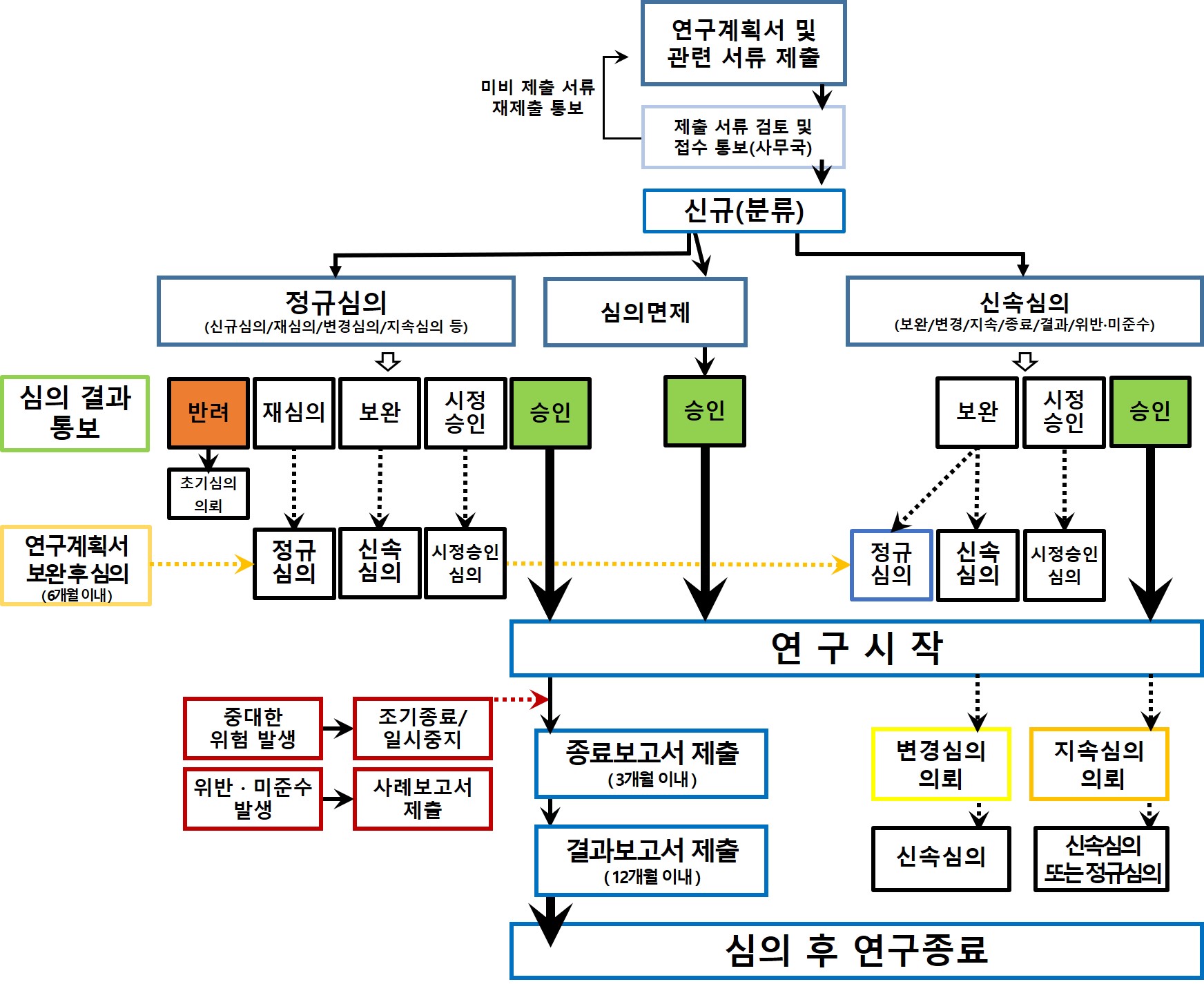 심의 신청은 서류의 원본을 제출하여야 합니다(직접 제출 또는 등기 우편 이용). 연구 진행 중 연구 계획 변경, 중대한 이상 반응 보고, 지속심의 등이 필요합니다. 이의 신청: 심의 결과 통보일 기준 14일 이내에 모든 심의 결과에 대하여 이의신청을 할 수 있습니다. 서면(<별지서식 30호> 이의신청서)으로 이의 신청 및 그 사유를 제출하시면 됩니다.